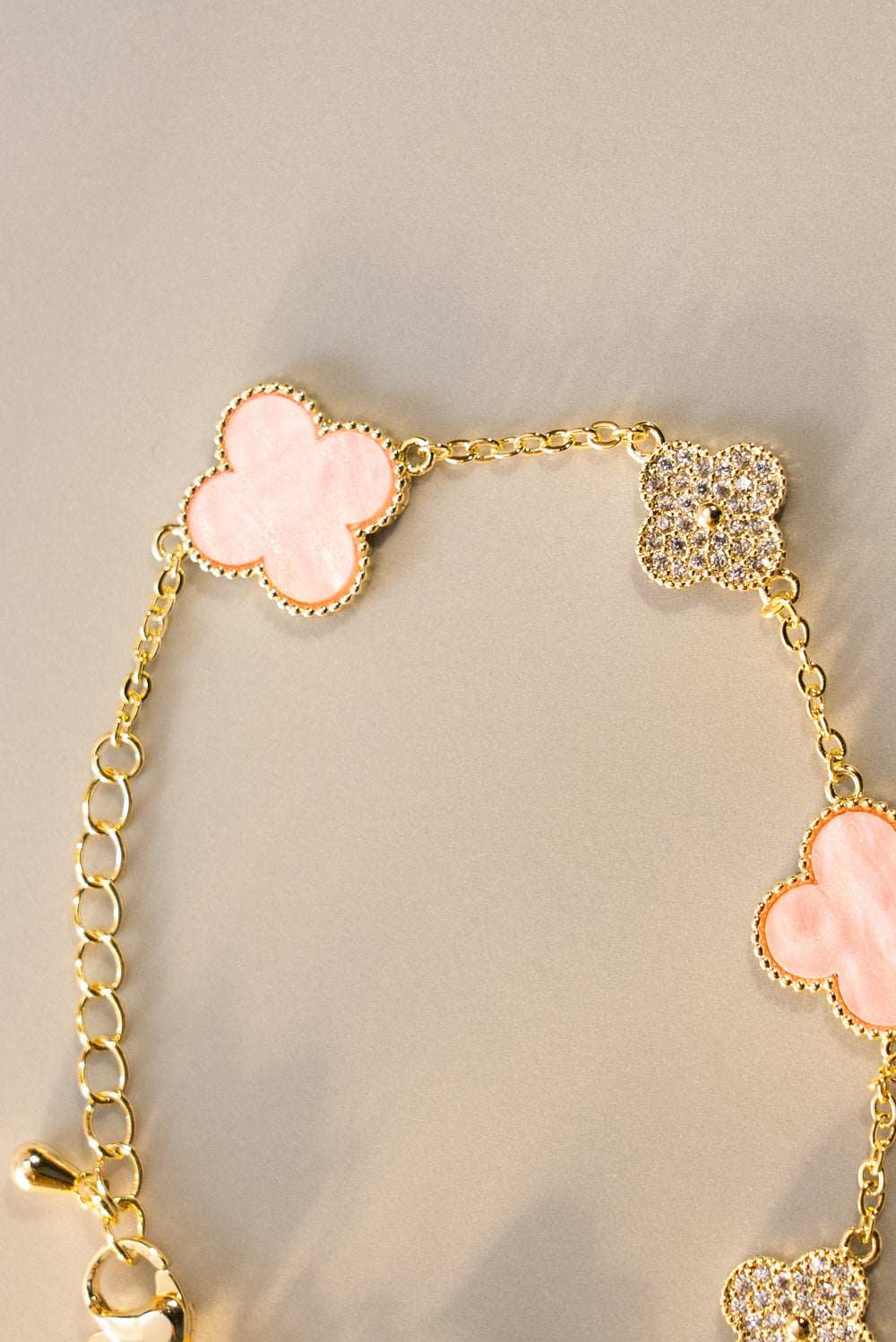 Baby pink Van-inspired clover bracelet with rhinestones.
